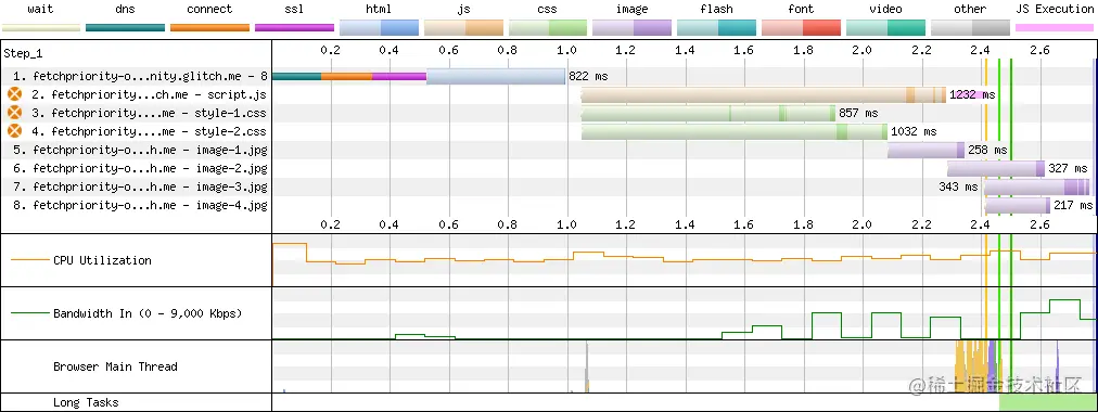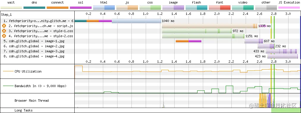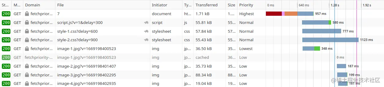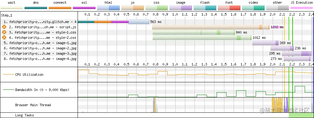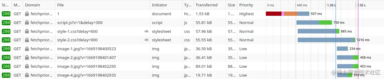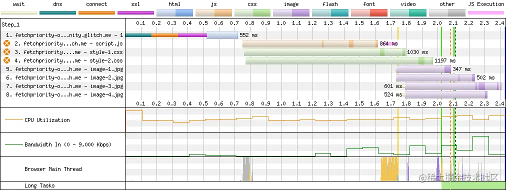 Low优先级文件 image-1.jpg 在High优先级 style-1.css 文件之前开始下载,因为在文档标记中<link rel="preload">位于其上方。
