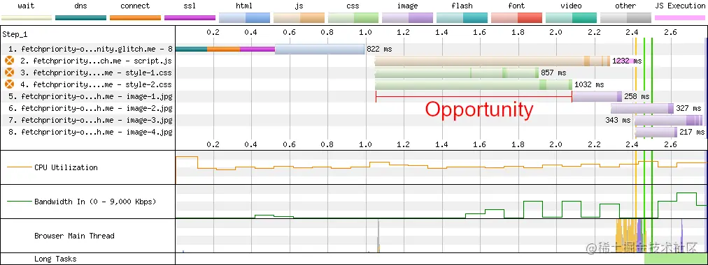 fetchpriority的好处是发现资源的时间和开始下载的时间之间的时间差。我将此称为“opportunity”。因此,如果一个资源发现得早,但浏览器开始下载的时间晚,那么opportunity就更大。