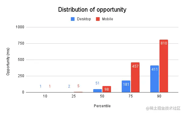 Low和High优先级的移动设备的opportunity分布。在中间值处,High优先级请求的 LCP 图像在被发现后 21 毫秒开始下载,而Low优先级请求的 LCP 图像在 102 毫秒后开始下载。在75%和90%处差异甚至更大。