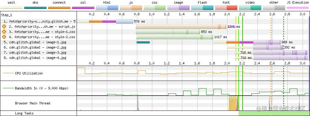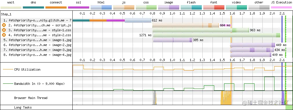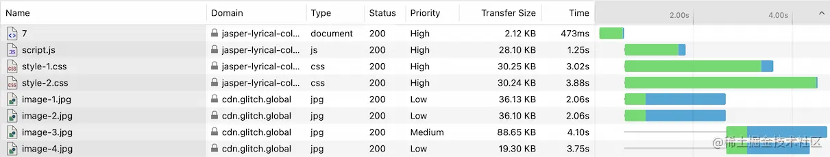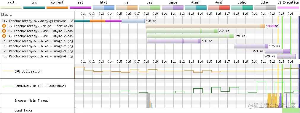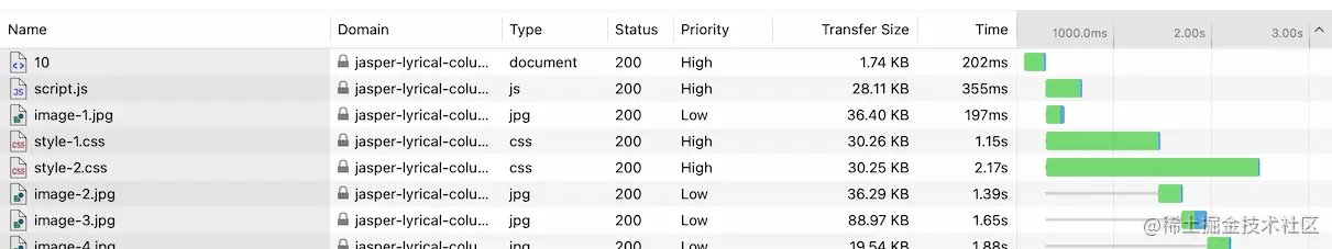 在上面的瀑布图中,您可以看到资源 image-1.jpg 即使它立即被发现,也会等到 style-2.css 完成下载后才开始下载。此时,只有script.js一个资源仍在传输中,这时浏览器开始下载