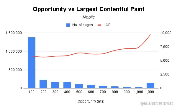 上图绘制了针对 LCP 的opportunity(以毫秒为单位)。opportunity以 100 毫秒为一组进行存储,而大于 1,000 毫秒的任何时间都被分组到一个存储桶中。该图表显示了“opportunity”与 LCP 之间的强相关性 - opportunity越大,LCP 越差。