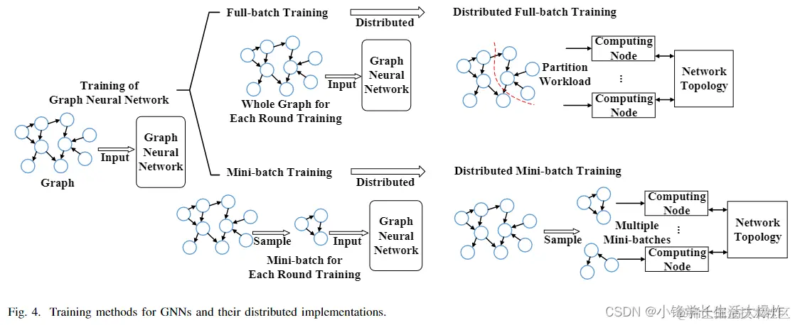 如图4所示,GNN的训练方法可分为全批训练[69]、[70]和小批训练[13]、[71]–[74],这取决于每一round是否涉及整个图形。这里,我们定义了一round完整的批量训练,包括模型计算阶段(包括正向和反向传播)和参数更新阶段。另一方面,一round小批量训练还包含采样阶段,该阶段对后续模型计算所需的小工作量进行采样,因此位于其他两个阶段之前。因此,被定义为整个数据传递的epoch相当于一轮完整的批量训练,而小批量训练中的epoch通常包含多round。下面将介绍这两种方法的详细信息。