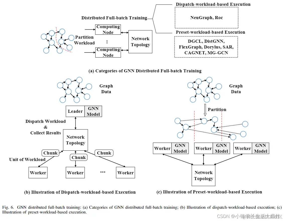 • 第四节介绍了GNN的分布式全批量训练,并将其进一步分类为两种类型,其中详细介绍了工作流、计算模式、通信模式和优化技术。