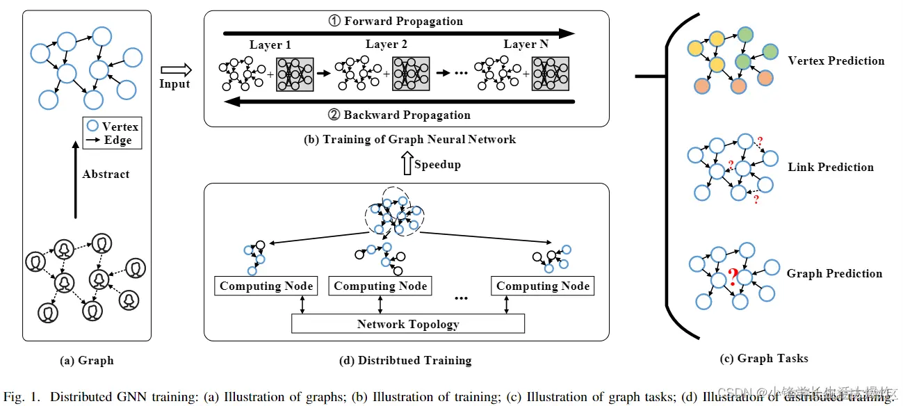 与其他算法模型相比,图形神经网络(GNN)在图形学习方面表现出了优异的性能[9]-[11]。深度神经网络(DNN)已广泛用于分析图像等欧几里得数据[12]。然而,由于图的任意大小和复杂拓扑结构,它们受到了来自非欧几里得域的图数据的挑战[13]。此外,工业界发现的深度学习范式的一个主要弱点是它们不能有效地进行因果推理,这大大降低了智能系统的认知能力[14]。为此,GNN已成为图形学习的首要范式,并赋予智能系统认知能力。GNN的图示如图1(b)所示。在获得图形数据作为输入后,GNN使用正向传播和反向传播来更新模型参数。然后,训练后的模型可以应用于图形任务,包括顶点预测[15](预测特定顶点的属性)、链接预测[16](预测两个顶点之间的边的存在)和图形预测[17](预测整个图形的属性),如图1(c)所示。