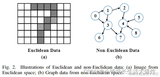 图是一种由顶点和边组成的数据结构。其灵活的结构可以有效地表达一组具有任意大小和不确定结构的对象之间的关系,称为非欧几里得数据。如图2(a)和(b)所示,非欧几里得数据的形式不像欧几里得数据那样高度结构化。然而,通过使用顶点来表示对象,使用边来表示对象之间的关系,图可以有效地表示非欧几里得数据,例如社交网络和知识图。