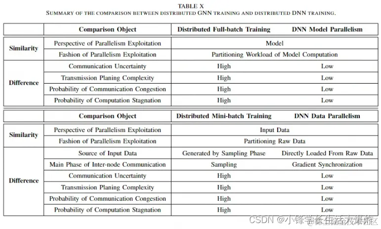 在本节中,我们通过比较GNN 和 DNN 的分布式训练来强调 GNN 分布式计算的特点。我们首先介绍分布式 DNN 训练的两大类:数据并行和模型并行。其中,对于GNN分布式full-batch训练,其运行方式类似于DNNs的模型并行。 GNN 分布式小批量训练类似于 DNN 的数据并行性。下面分别比较这两对。分布式 GNN 训练和分布式 DNN 训练之间的比较总结如表 X所示。接下来,我们分别介绍它们。