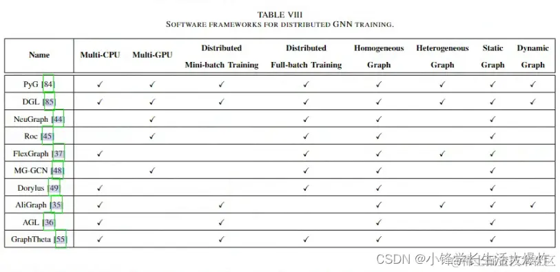 • 第六节介绍了目前支持分布式GNN训练的软件框架,并描述了其特点。