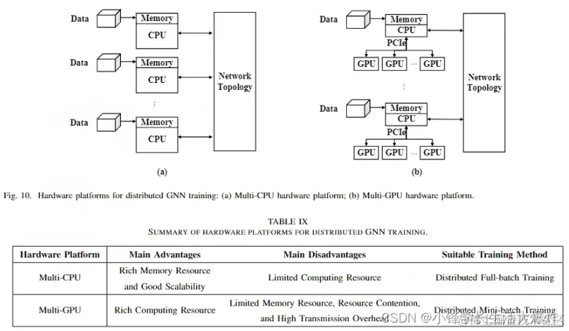 表 IX 显示了多 CPU 硬件平台和多 GPU 硬件平台之间的比较总结。多CPU和多GPU硬件平台各有优势,适用于不同的场景。两者不同的特点也导致了不同的优化方向。多CPU硬件平台更适合分布式full-batch训练。整个图可以缓存在内存中,这带来了良好的可扩展性。由于内存资源有限,多 GPU 硬件平台更适合分布式mini-batch 训练。 然而,当图尺寸较小且 GPU 之间存在高速互连(例如 NVLink)时,使用多 GPU 硬件平台的分布式全批次训练可以获得良好的性能 [45]。