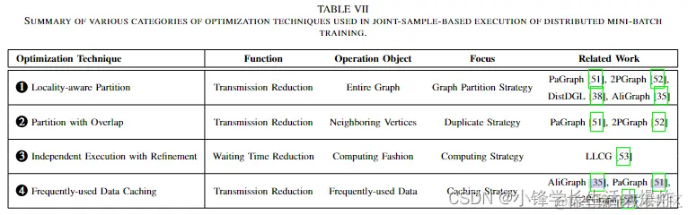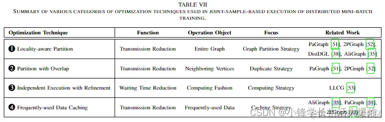 优化分布式全批次训练的主要重点是减少其通信开销[37]、[40]、[44]-[47]、[49]。在这种训练方法中,每个计算节点不可避免地需要与其他节点通信以获取整个图结构的信息,以便完成需要未存储在本地拆分中的图数据的操作,例如聚合相邻节点的信息分布在其他计算组件中。因此,主要通过合理拆分图和规划数据传输来减少通信开销,可以大大提高计算效率。