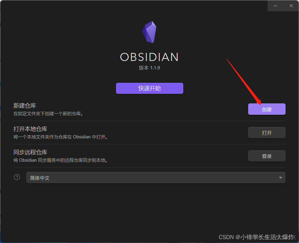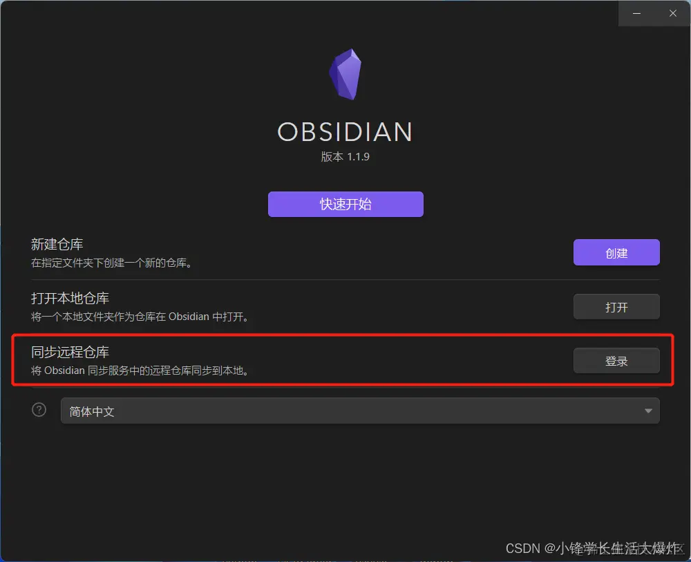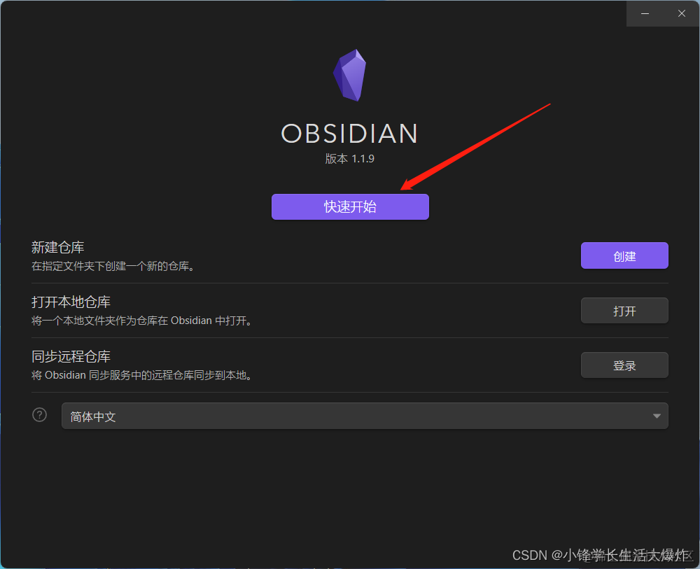 如果想默认安装,就直接点“快速开始”。那个仓库的位置默认在“C:\Users\用户名\Documents\Obsidian Vault”。如果想重新选择,把这个文件夹删了,再打开软件,就又进入了选择界面。