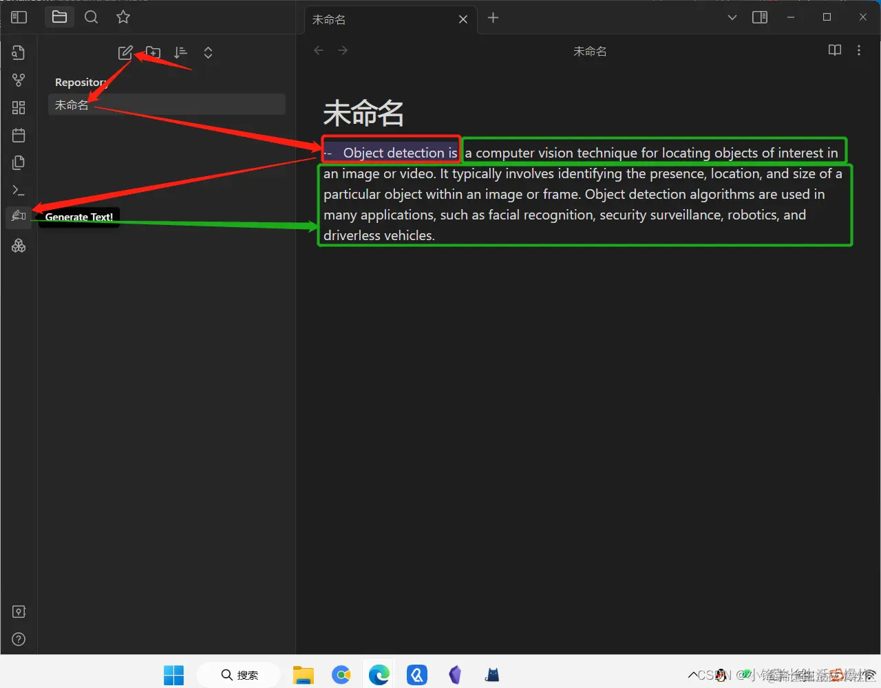 我们输入红色框内的“Object detection is”,然后点击“Text Generator”,插件自动帮我们生成了绿色框的内容。效果还是非常好的。