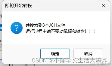 confirm = pyautogui.confirm(title="即将开始转换", text=f"共搜索到{len(jchs)}个JCH文件\n运行过程中请不要动鼠标和键盘!!!", buttons=['OK', 'Cancel'])