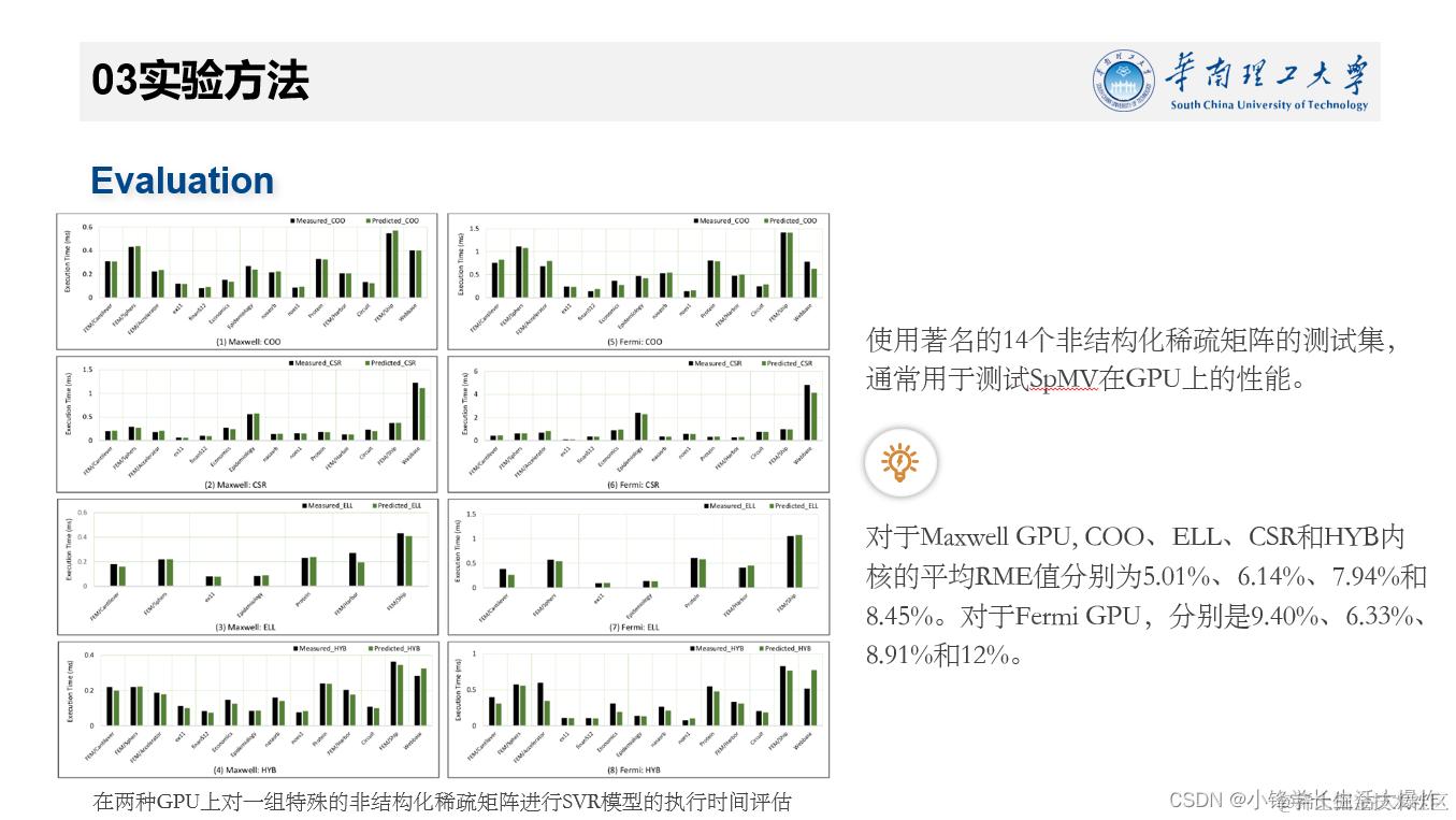 实验发现,对于Maxwell GPU, COO、ELL、CSR和HYB内核的平均RME值分别为5.01%、6.14%、7.94%和8.45%。对于Fermi GPU,分别是9.40%、6.33%、8.91%和12%。