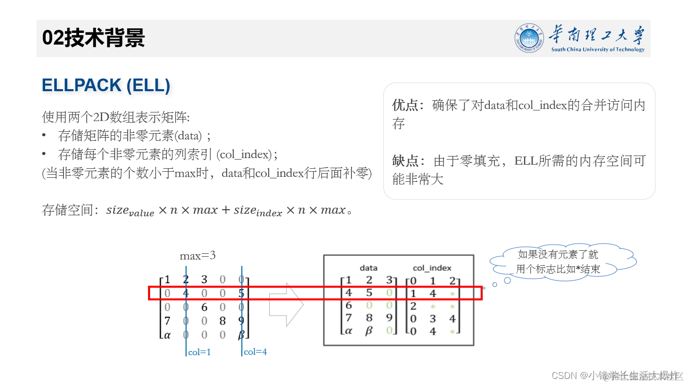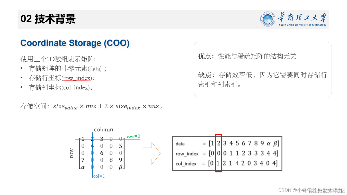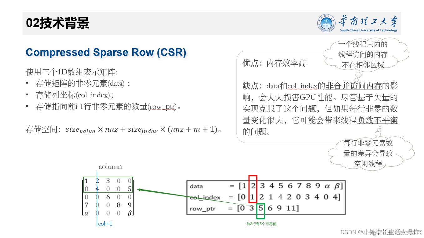 与COO相比,虽然同样采用了3个数组来表示,但CSR存的内容更少,因此内存效率相对较高。