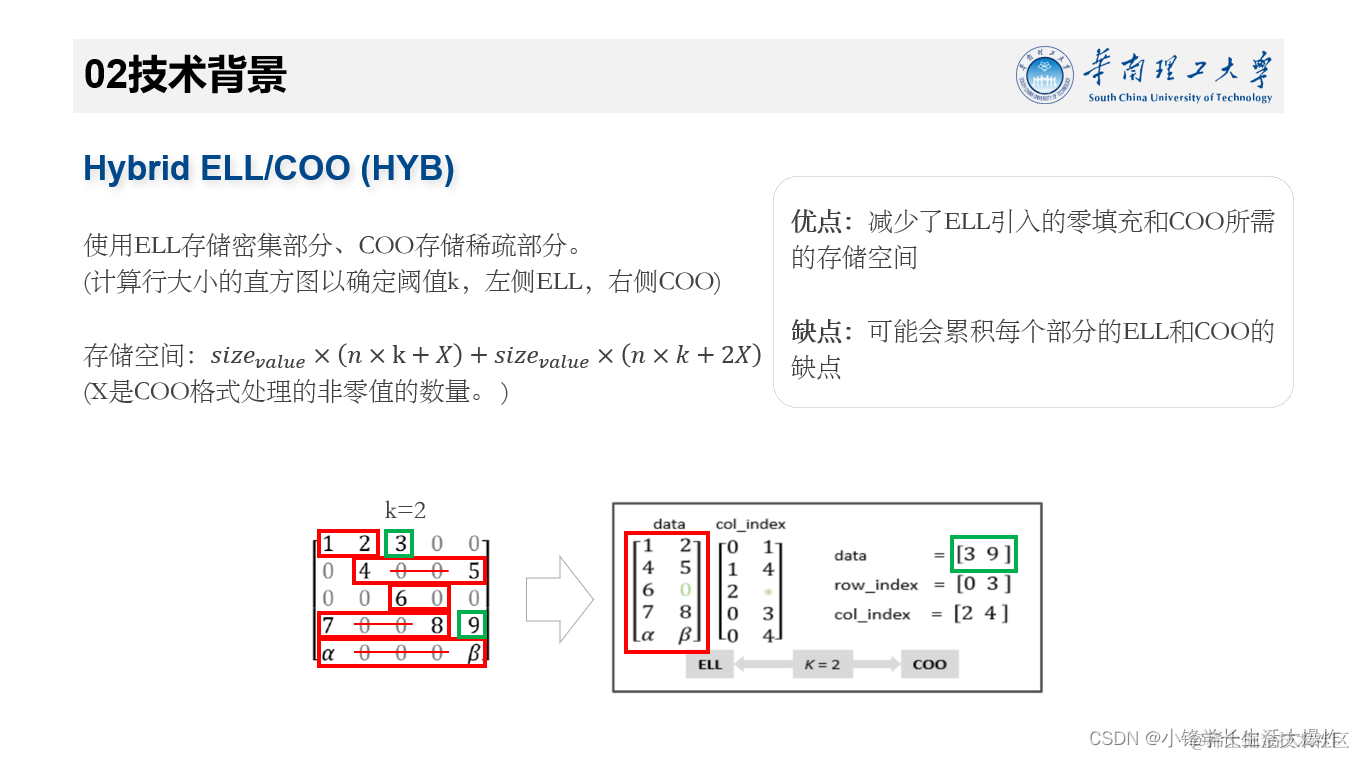 首先计算行大小的直方图以确定阈值k,每列左侧k个为ELL,其余右侧为COO。