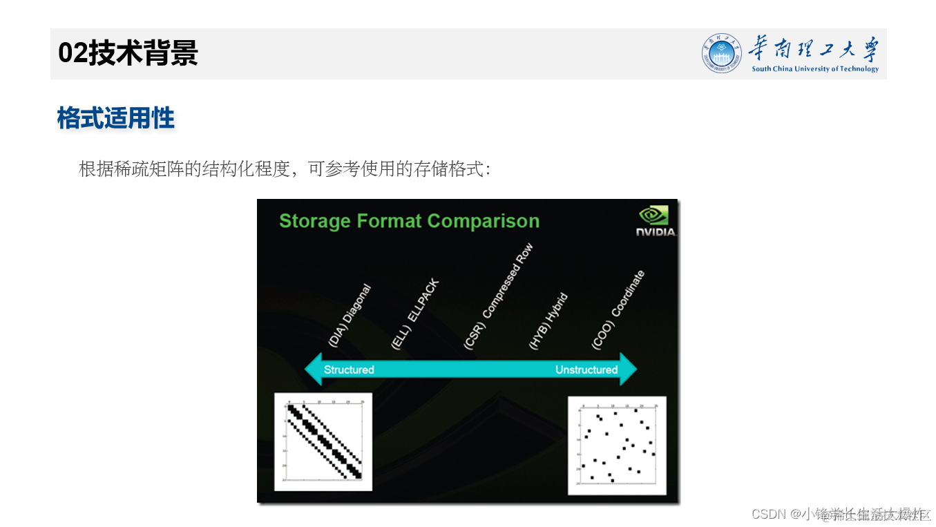 一种可行的优化方法是将矩阵压缩,转为不同的格式进行存储,主要思想是如何高效地记录下非零值。