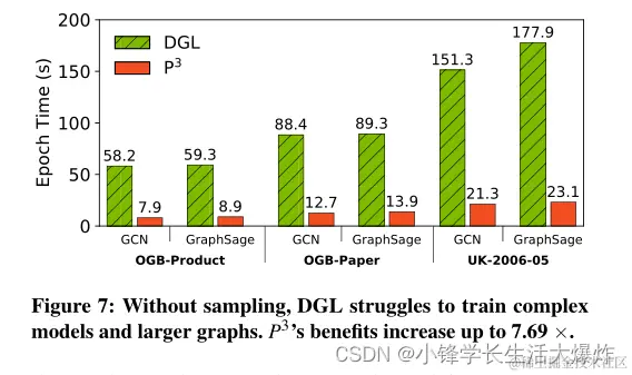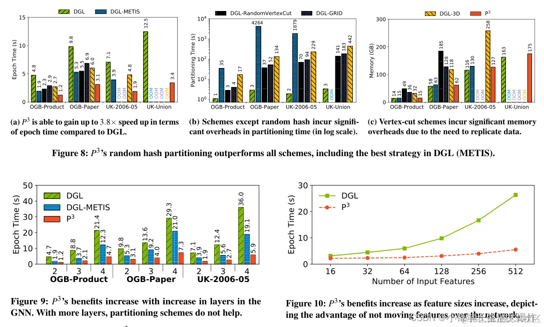 这些技术的结合使P3的性能比最先进的分布式GNN框架DGL[1]高出7倍。此外,P3能够支持更大的图,并且可以优雅地伸缩(§5)。