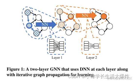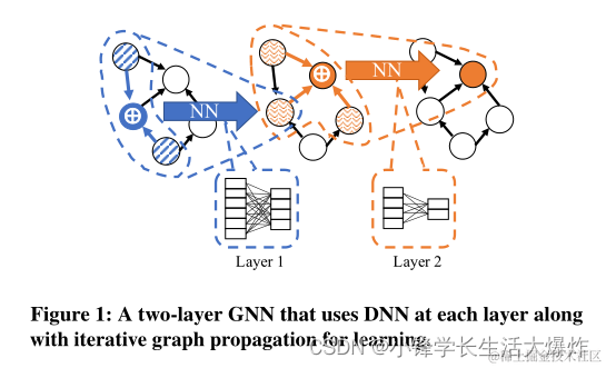 在高层次上,gnn通过结合迭代图传播和DNN操作(例如,矩阵乘法和卷积)来学习嵌入。图结构用于确定要传播什么,神经网络指导如何进行聚合。每个节点基于其邻域创建一个k-hop计算图,并使用它们的特征学习其嵌入。训练gnn和dnn之间的关键区别之一是数据样本之间的依赖关系: 传统的dnn训练彼此独立的样本(如图像),而图的连接结构强加了依赖关系。此外,在图中与每个节点关联的大量密集特征(从100个到几千个[29,66,68])是很常见的。因此,由每个节点创建的k-hop计算图可能大得令人望而却步。邻域采样[24]等技术在一定程度上有所帮助,但根据图结构的不同,即使是采样的计算图和相关特征也可能无法容纳单个GPU的内存,这使得可伸缩性成为训练gnn的一个基本问题[71]。随着拥有数十亿节点和边的大型图在学术界和工业界[55]的流行,以分布式方式实现GNN训练是一个重要而富有挑战性的问题。