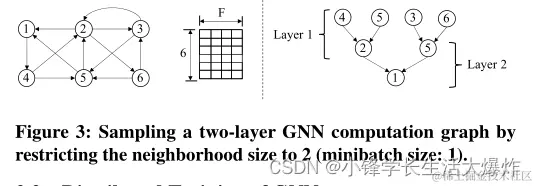 与训练数据彼此独立(如图像)的传统dnn不同,gnn以图结构的形式在训练输入之间施加依赖关系。因此,即使提供的批处理大小可能很小(例如1000),由于k-hop邻域和相关特征,计算图样本可能会呈指数级增大。如此大的尺寸的一个主要原因不是图结构本身,而是特征,其大小通常在100到几千秒之间[29,41,66,68]。在由数十亿节点和边组成的真实图中[15,55],2跳邻域可能比1跳邻域[43]大一个数量级。当结合这些特性时,得到的计算图很容易超过单个GPU的内存,甚至超过服务器的主存。解决这种邻域爆炸的常用技术是[24]采样。也就是说,我们不获取每一跳节点的所有邻居,而是只选择一个固定的数目。如图3所示,其中节点1的2跳计算图是通过在每一跳采样两个邻居生成的。然而,即使有了采样,基于使用的采样和GNN中的层数,计算图的大小也会大幅增长。由于这些邻域节点及其特征必须通过网络获得,因此gnn的分布式训练在网络通信中花费了很大一部分时间。