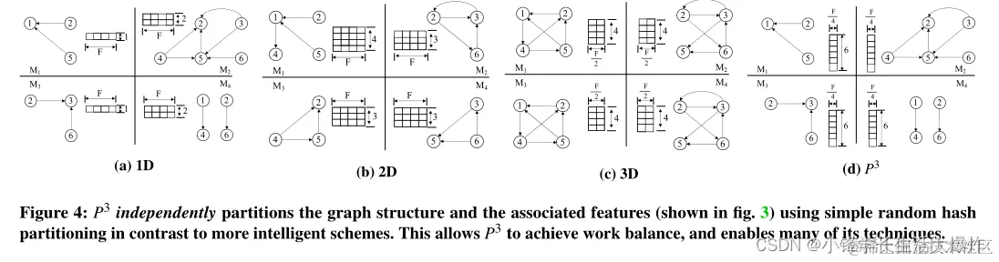 虽然图形结构可能适合内存,但输入特征却不能这样说。典型的gnn处理的输入图的特征向量大小从100到几千秒不等[29,41,66,68]。P3沿特征维度对输入特征进行分区。也就是说,如果特征的维数为F,那么P3将每个节点的F/N特征分配给N台机器集群中的每台机器。这与现有的针对机器学习任务的分区方案形成了对比,包括最近提出的3D分区方案[69]。图4显示了P3如何将一个简单的图与现有的流行分区方案进行比较。