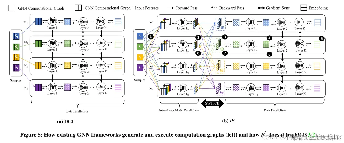 在每个小批的开始,其嵌入被计算的每个节点生成其计算图。为此,P3为节点拉取k-hop邻域。如果GNN架构支持基于采样的嵌入计算,P3抽取采样的k-hop邻域,否则抽取完整的k-hop邻域。注意,与现有的GNN框架不同的是,在这两种情况下特性都不会被提取。这大大减少了创建计算图所需的网络通信。如果整个图结构在每台机器上都可用,则这是一个本地操作,否则将导致最小的网络通信,因为图结构的权重非常轻。在这个过程结束时,P3在拥有该节点的机器上得到了小批中每个节点的k层计算图(例如,图5中的四个样本对应于小批中四个节点的计算图)。注意,现有的GNN框架除了提取结构之外还提取特征,因此在这些框架中,拥有节点的机器最终会获得计算图和嵌入计算所需的所有特征。