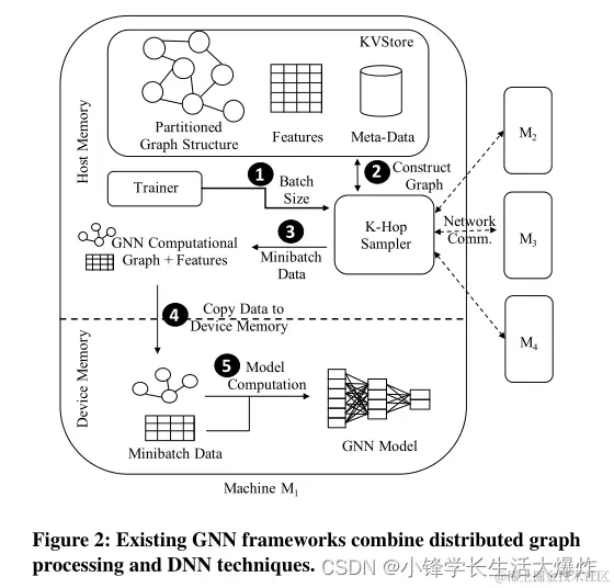 现有的训练gnn的框架,如深度图库(DGL)[1],通过将分布式图处理技术与DNN技术相结合,支持分布式训练,如图2所示。输入图和特征在集群中的机器之间进行分区。给定批处理大小(1),通过将每个节点的k-hop邻域和相关特征(2)拉出,生成批处理中每个节点(通常称为训练样本)的计算图。这需要与集群中的其他机器进行通信。一旦构建了计算图,标准的DNN技术(如数据并行)被用来执行计算——创建小批并复制到GPU内存(4),然后模型计算被触发(5)。