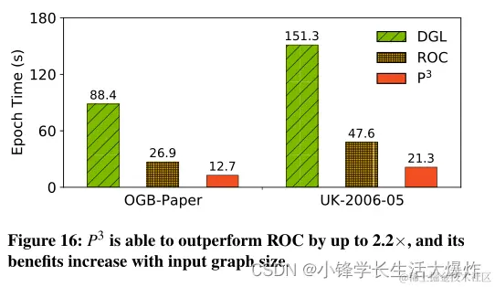 - 与DGL相比,P3能够提高最高7×的性能,最高2.2×的ROC;它的好处随着图表的大小而增加。