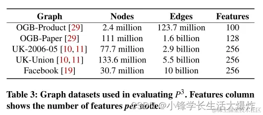 数据集与比较: 我们在表3中列出了我们在实验中使用的五个图表。前两个是来自OGB资源库[29]-OGB-Products[29](亚马逊产品联合采购网络)和OGB- papers[29](微软学术图[57]索引的论文之间的引用网络)的最大图表,在这里我们可以确保P3在各种任务中的正确性并验证与最佳报告结果[4]相比的准确性。后三种方法分别是uk -2006-05[10,11]、。uk域的快照、UK-Union[10,11]、相同的12个月时间感知图以及模拟社交网络的合成图Facebook[19],它们被用来评估P3的可伸缩性。我们之所以选择这些,是因为缺乏专门用于GNN任务的如此大规模的开源数据集。这两个OGB图包含特性。对于剩下的三个,我们生成随机特征,确保标记节点的比例与我们在OGB数据集中观察到的保持一致。这些数据集代表了最近GNN研究评估中使用的一些最大的开源图表5。我们对DGL[1,61]和ROC[36]进行了比较,这是两种性能最好的支持分布式训练的开源GNN框架——据我们所知——在我们进行评估时。然而,由于在撰写本文时ROC所施加的限制,特别是它只支持全批训练和GCN实现的可用性,我们仅在可行的情况下与ROC进行比较,并在其余的实验中使用DGL。虽然DGL使用METIS分区器作为默认值,但我们将其更改为在所有计算中使用哈希分区,除非指定。这有两个原因。首先,哈希是唯一可以处理数据集中所有五个图而不会耗尽内存的分区器。其次,METIS会产生大量的计算开销,常常超过总训练时间(见§2)。