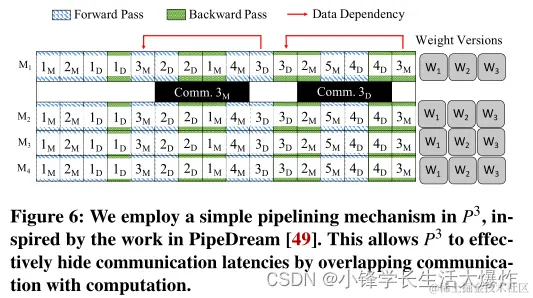 在P3中,我们采用了一个简单的流水线机制,灵感来自于PipeDream的流水线并行[49]。由于我们在P3中采用了推拉并行的方法,即在第1层的模型和数据并行之间切换,P3需要在每个小批中执行四个阶段: 前向通中的模型并行相位,前向通中的数据并行相位,后向通中的数据并行相位,最后是后向通中的模型并行相位。这为我们提供了在阶段之间创建数据依赖之前安排3个小批计算的机会。因此,我们在两者之间重叠计算,如图6所示。如图所示,在正向通段中,小批3的数据并行阶段(记为3D)对正向通段中的模型并行阶段(3M)有数据依赖性。因此,当3M阶段开始通信时,我们从其他小批中安排两个向前和两个向后传递。这种2向前2向后的静态调度策略允许我们避免停顿。我们目前使用静态管道调度——尽管基于分析的方法来确定管道调度可能会带来好处,但我们将其推迟到未来的工作中。