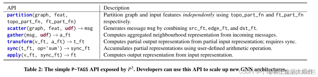 P3将其独立分区策略、流水线推拉并行和缓存封装在一个简单的API中,开发人员可以使用它来加速新的GNN架构。该API如表2所示,由以下六个函数组成: