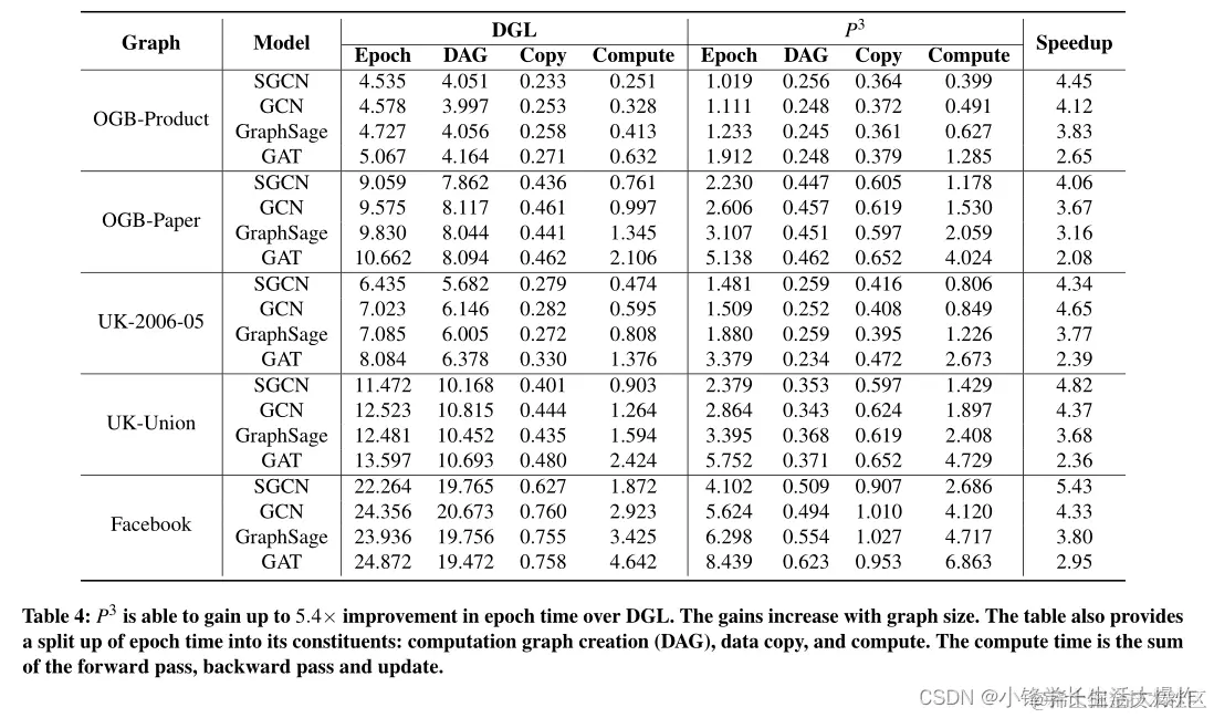 我们首先展示总体结果。在这里,我们比较DGL和P3在每个epoch time。对于P3,我们禁用缓存(§3.4),以便它使用与DGL相同的内存量进行公平的比较。注意,启用缓存只对P3有好处,我们将在本节后面介绍缓存的好处。我们在所有的图上训练所有的模型,并报告每个epoch的平均时间。结果如表4所示。