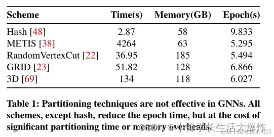 首先,许多分区方案在计算和/或内存开销方面产生成本。在表1中,我们展示了一个代表性GNN、GraphSAGE[24]上的分区时间、内存消耗和完成一个训练周期的时间,用于四种不同的分区方案:哈希[48]使用随机哈希对节点进行分区,METIS[38]是一种平衡的最小边切分区器,RandomV ertexCut[22]和GRID[23]是点切分区器,以及3D[69],一种最近提出的用于机器学习工作负载的方案。我们看到,性能最好的分区方案(例如,切边)会产生很高的计算开销。计算速度较快的方案要么导致较高的内存开销(由于复制,例如,顶点切割),要么导致性能下降。