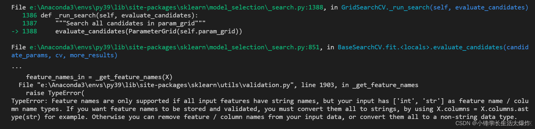 【解决】保存h5或用Pipeline时报错Feature names are only supported if all input features have string names 小锋学长生活大爆炸 2023-05-22 86 阅读1分钟 转载请注明出处:小锋学长生活大爆炸[xfxuezhang.cn] 目录 问题描述 问题分析 解决方案 问题描述 报错示例如下: 问题分析 实际他已经给了很明确的提示以及解决方法。 问题就是你的给的数据列里包含了超过1种的数据类型,即[str, int]。 解决方案 只保留一种数据类型即可。我们这里把int改为str。 # 需要将列名从[str, int]转换为string x_tr.columns = x_tr.columns.astype(str) 这样就可以了