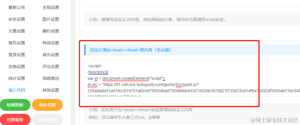 1、进入管理后台,在“ 插入代码 ”处选“ 自定义增加 ”,或者其他可以输入“ 自定义代码 ”的地方,插入以下代码: