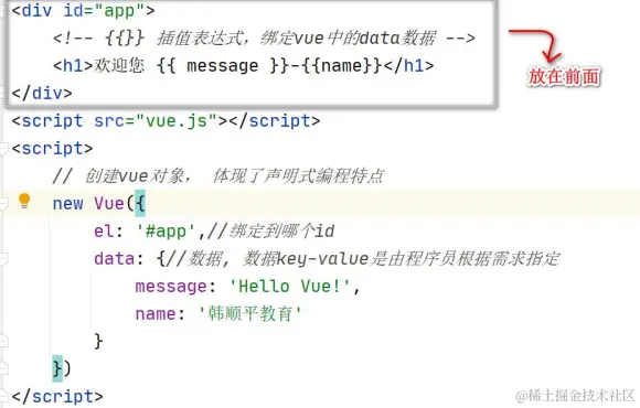 - 注意代码顺序,要求 div 在前,script 在后,否则无法绑定数据