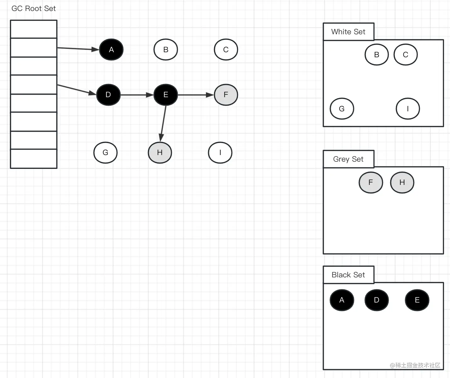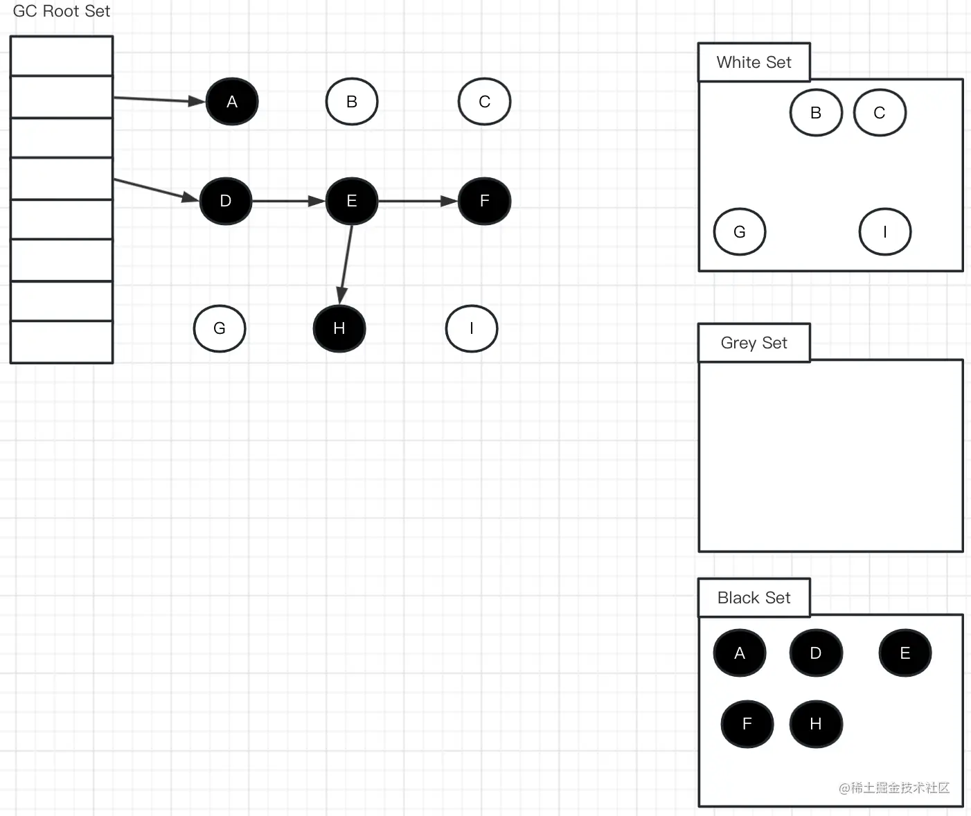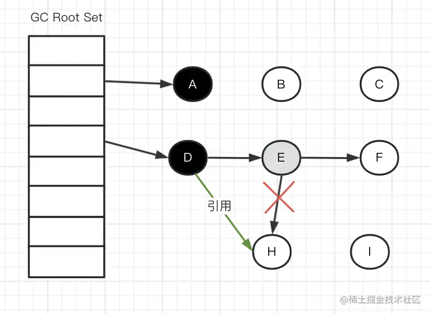 此时切回GC线程继续跑,因为E已经没有对H的引用了,所以不会将H放到灰色集合;尽管因为D重新引用了H,但因为D已经是黑色了,不会再重新做遍历处理。
