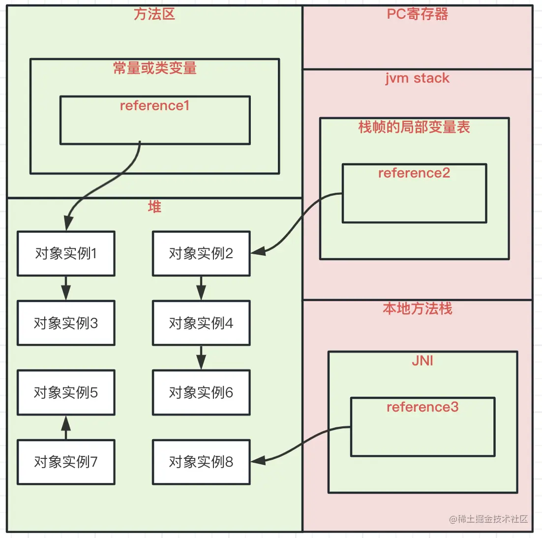 - 在方法区中类静态属性引用的对象,譬如Java类的引用类型静态变量。 ·在方法区中常量引用的对象,譬如字符串常量池(String Table)里的引用。