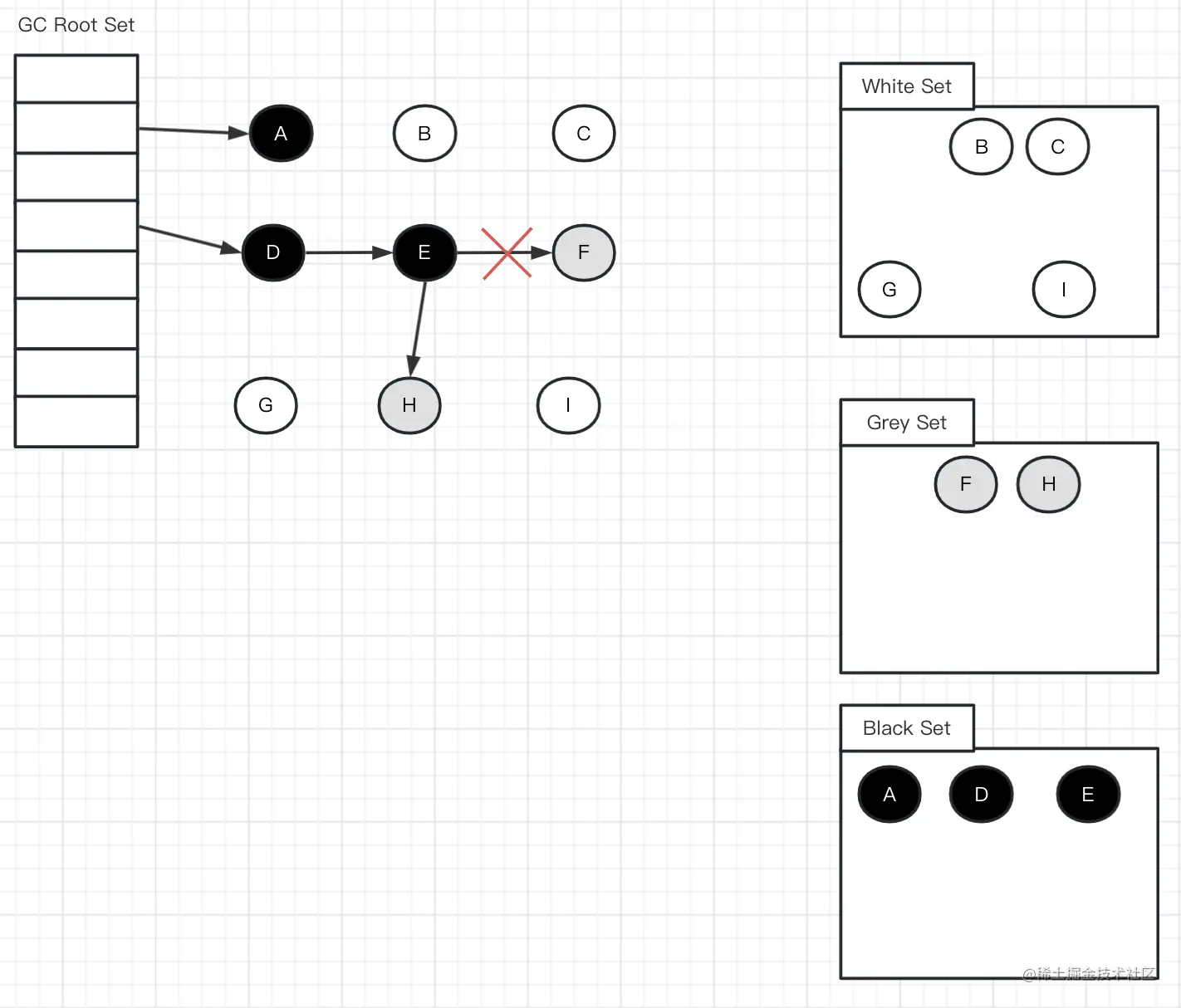 此刻之后,对象F是“应该”被回收的。然而因为E已经变为灰色了,其仍会被当作存活对象继续遍历下去。最终的结果是:这部分对象仍会被标记为存活,即本轮GC不会回收这部分内存。