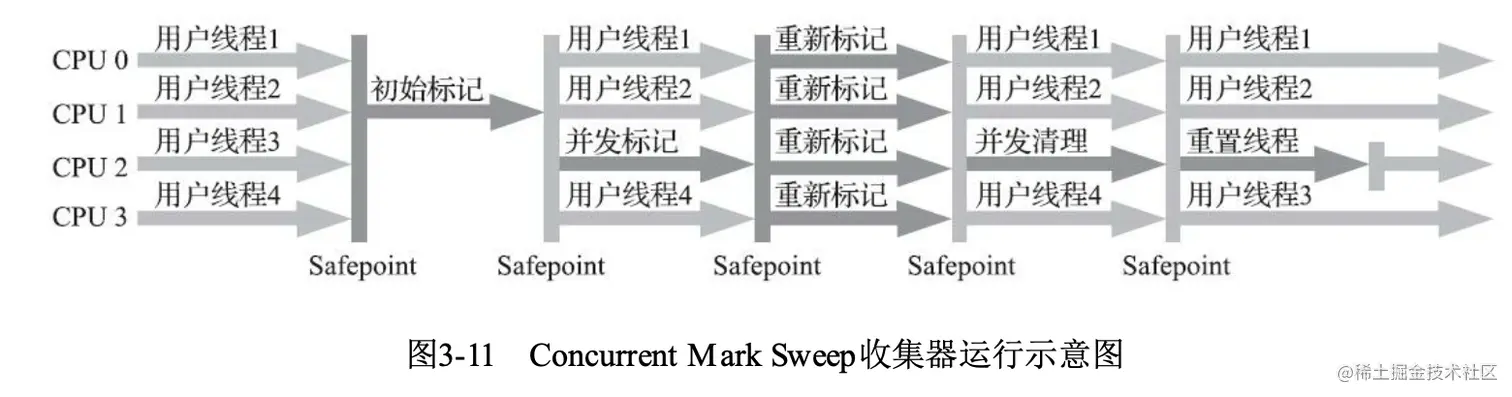 从名字(包含“Mark Sweep”)上就可以看出CMS收集器是基于标记-清除算法实现的,它的运作过程相对于前面几种收集器来说要更复杂一些,整个过程分为四个步骤,包括: