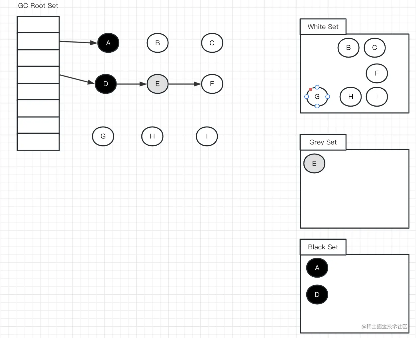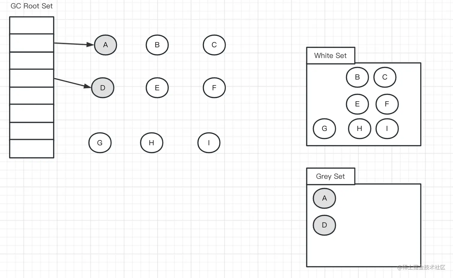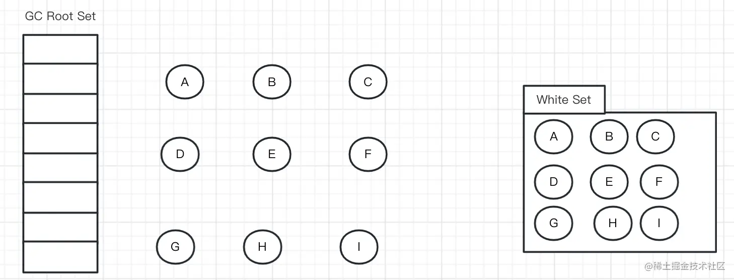 初始时,所有对象都在 【白色集合】中;