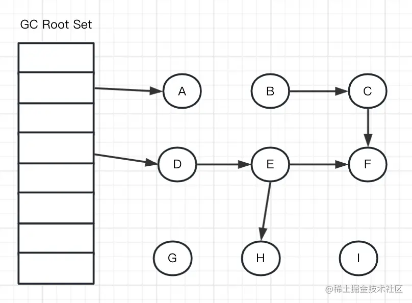 假设已经遍历到F(变为灰色了),此时应用执行了 objE.fieldF = null :