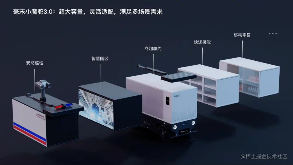 不应该忽略的还有小魔驼3.0的自动驾驶能力。在3颗固态激光雷达、7颗高清摄像头、IDC 3.0大算力计算平台等硬件加持,以及中国首个自动驾驶数据智能体系毫末MANA的赋能下,小魔驼3.0具备可落地的L4级自动驾驶,可以在混行、拥堵等复杂交通场景通行,城区末端配送实现现场无人跟随。