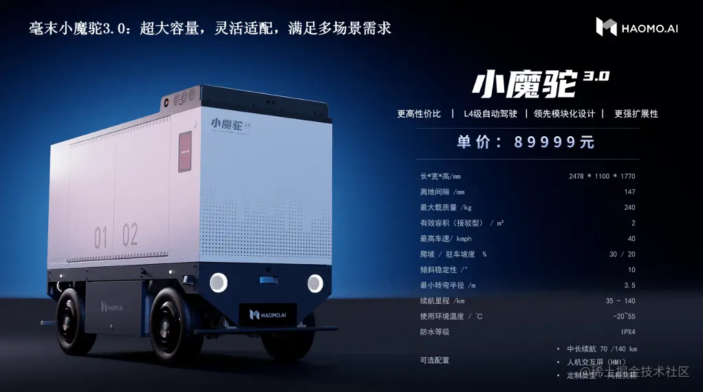 但在太平洋对岸的中国市场,末端物流自动配送正在加速商业落地。继单车售价12.88万元的小魔驼2.0后,毫末智行董事长张凯在第七届世界智能大会上官宣了小魔驼3.0,售价只有89999元,并具备L4级别自动驾驶能力。