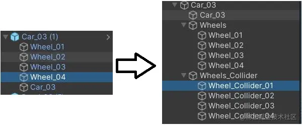 Unity 要求您在父游戏对象内排列所有车轮,将所有滚轮碰撞体排列在单独的父游戏对象中。看看下面的图片,看看汽车预制件是如何重新排列的。