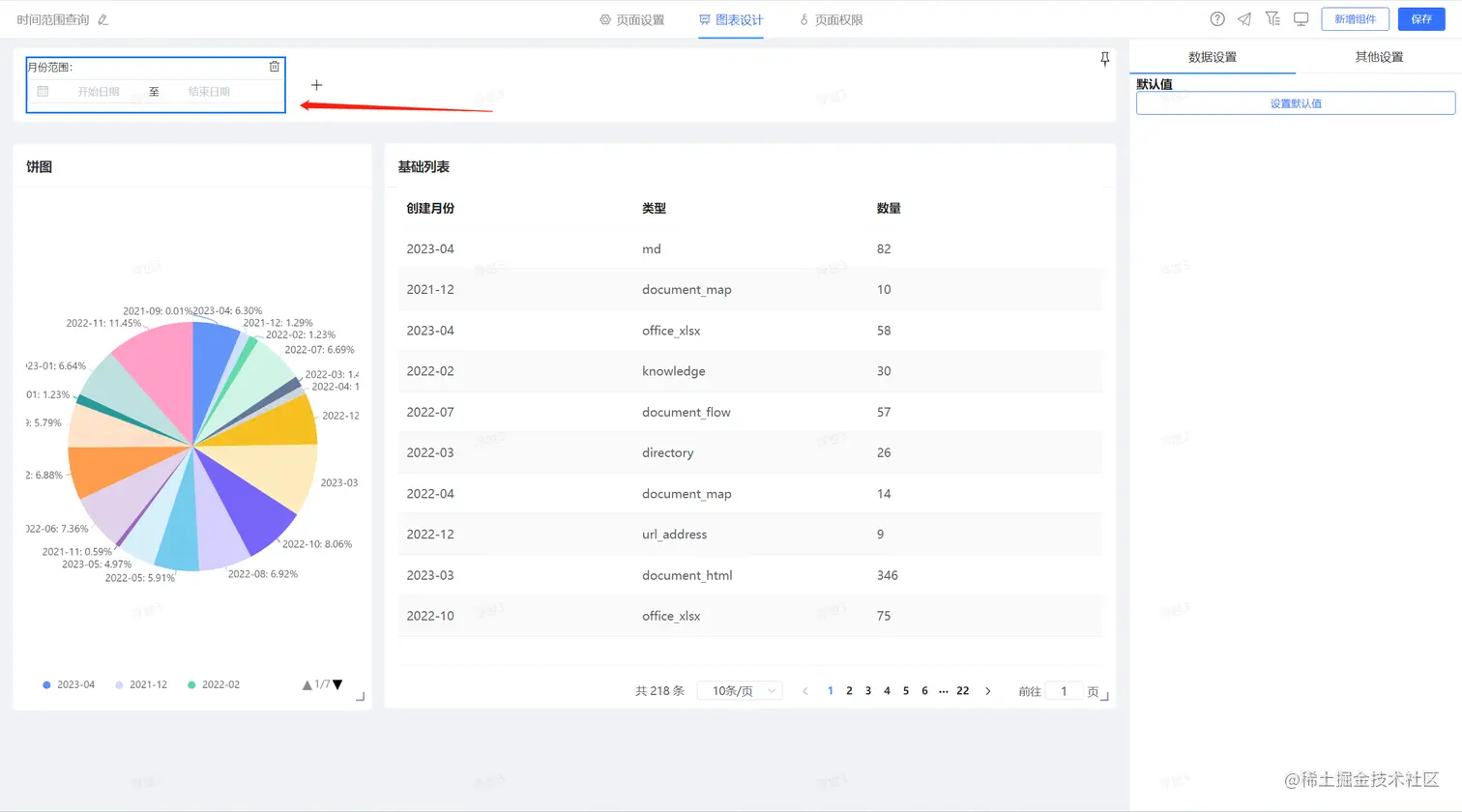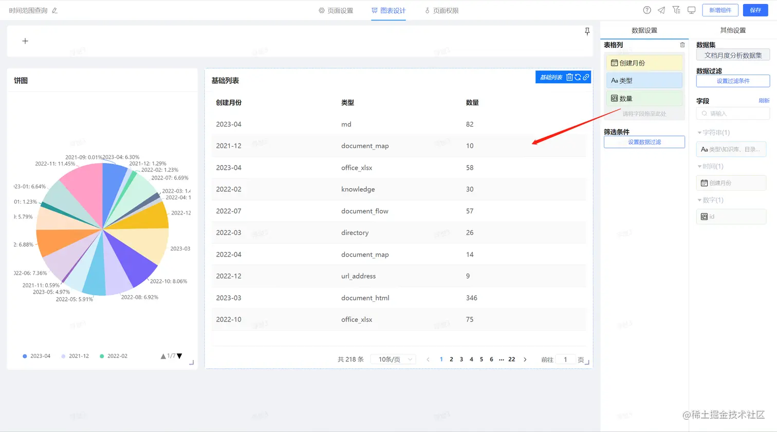 1、配置基础的数据展现组件,其中包括文档的分析图形组件、与项目的分析图形组件