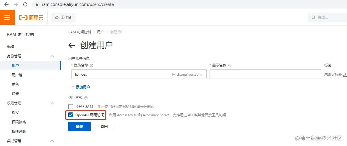 2.1获取access_key_id与access_key_secret,先点击用户,再点击用户登录名称