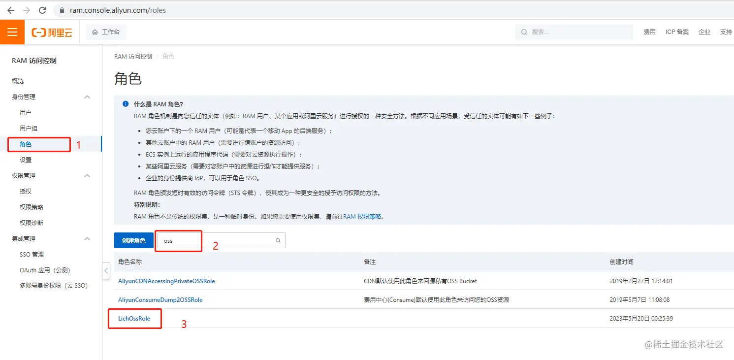 2.2获取role_arn,点击角色,搜索你自己创建的角色名,然后点击角色名