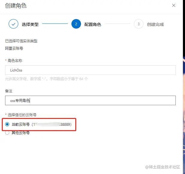 (填了主账号表示该主账号下的子用户或角色都被允许使用此角色。 如果是当前账号下的子账号需要使用, 直接选择当前云账号即可。)