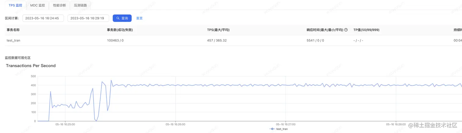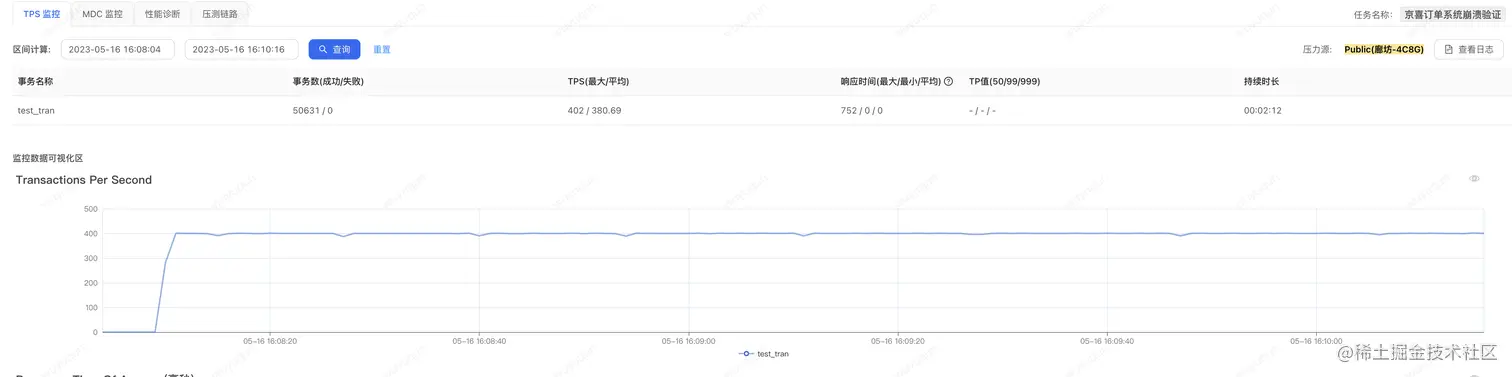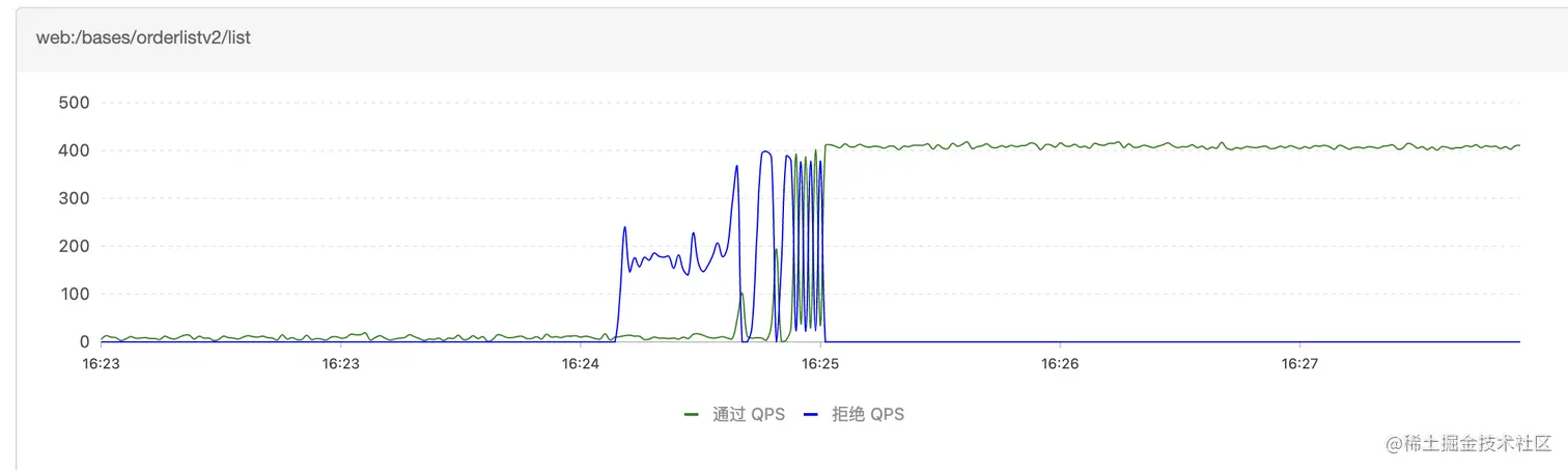 在热启动状态下,我们在上面压测完一轮之后再压测一轮,我们可以看到这个时候系统就没有一个“预热过程”的“准崩溃状态”了