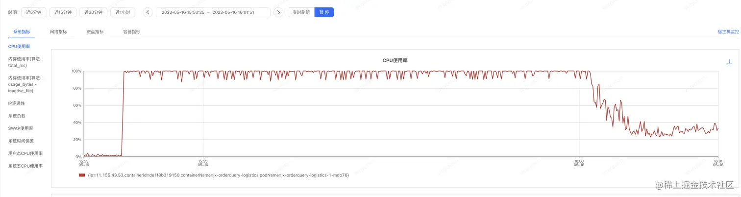 在没有配置如上规则的情况下,即便没有被击穿,我们看到,在冷启动的状态下,系统大概需要5-7分钟的时间来让系统从“准崩溃状态”中恢复回来,如下是CPU监控视图(大概6分钟左右处于高负载的CPU状态下,一旦恢复回来,CPU仅在30-40%左右)